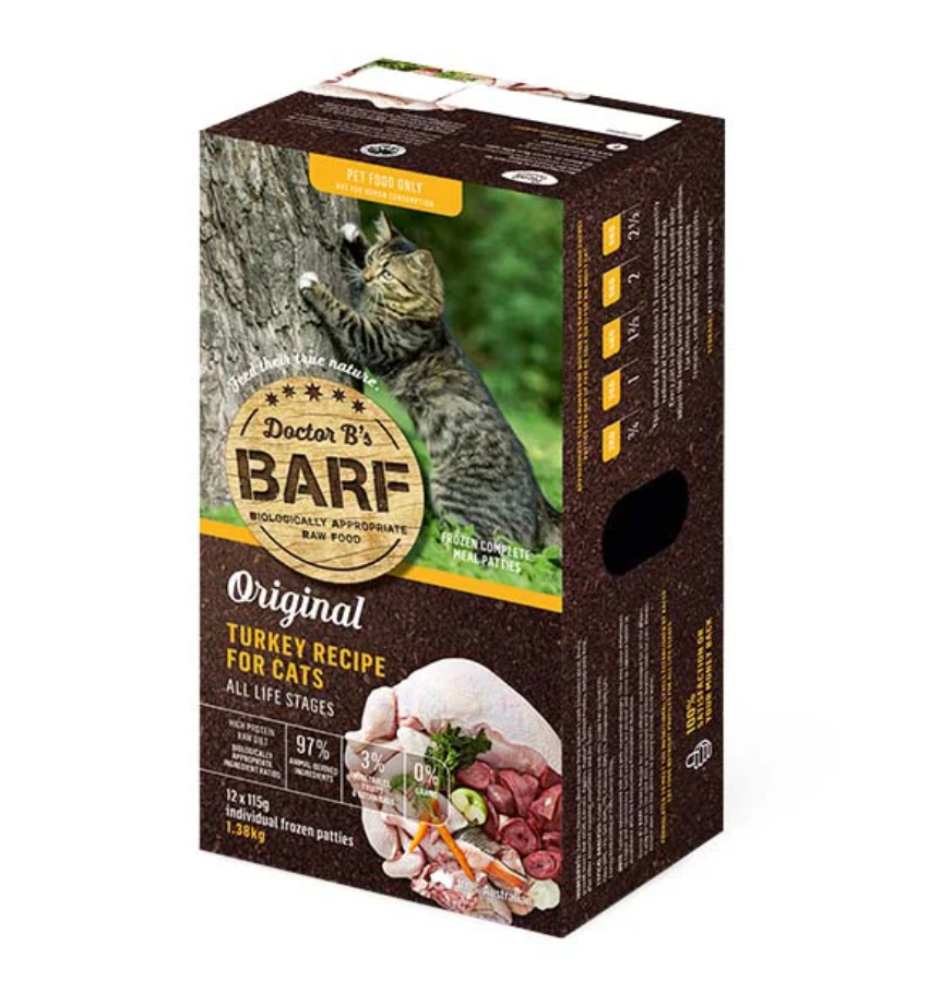 Doctor B’s Turkey Recipe BARF is complete and balanced for all life stages. As an anti-inflammatory white meat, it is suitable for cats with inflammatory or degenerative conditions. The high energy content is ideal for growing kittens and lactating queens.